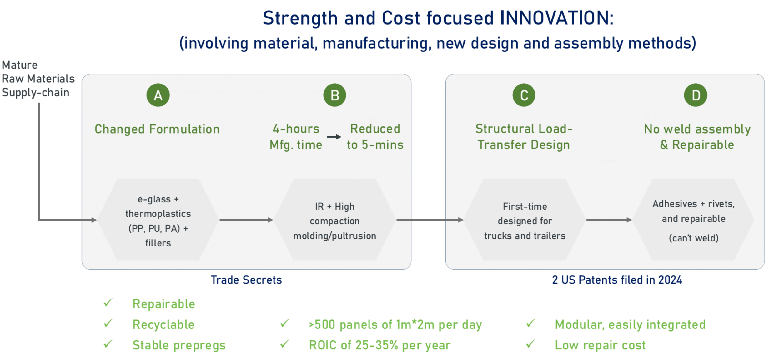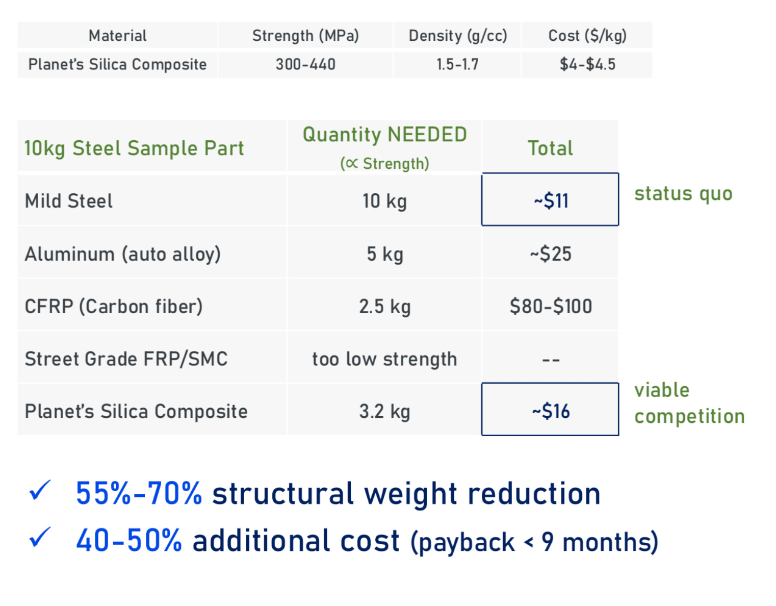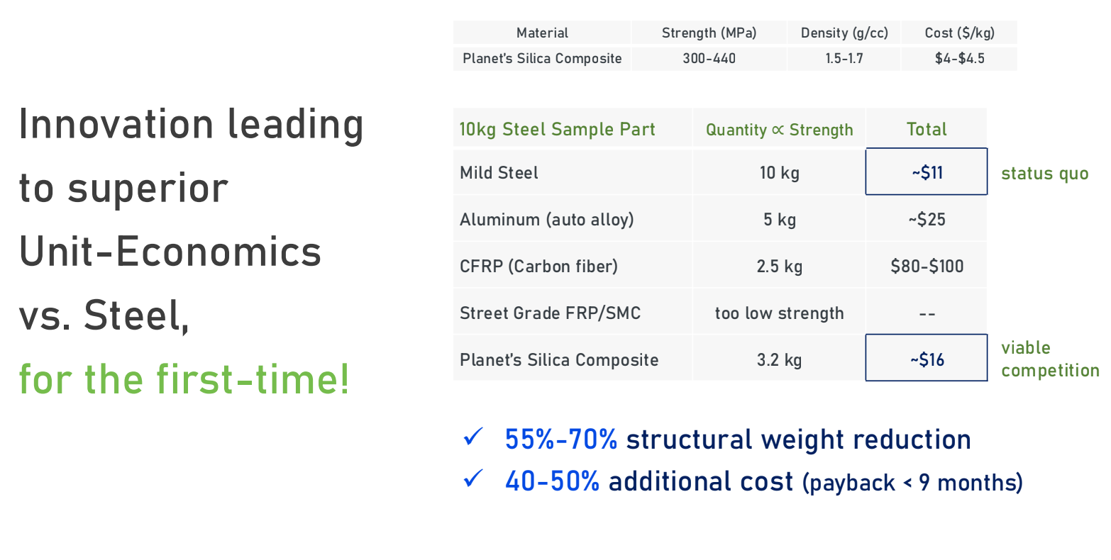 "Our ‘right to exist’ is this: replace steel in vehicles with advanced composite materials that are 75% lighter while maintaining superior strength. Our US patent pending silica composites have a flexural strength of 440 MPa—double that of steel's 220 MPa—while weighing just 1.7 grams per cubic centimeter compared to steel's 7.8 grams."