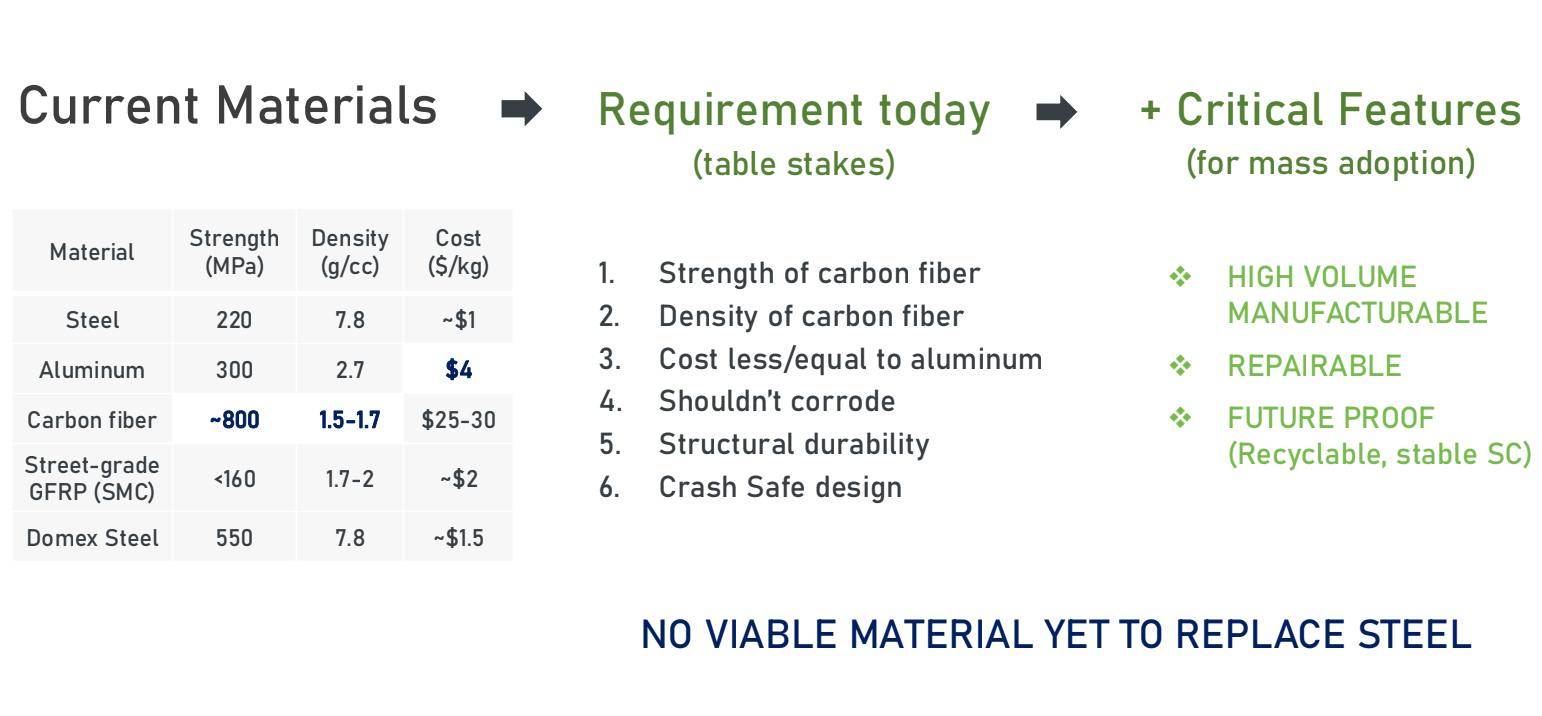 But replacing steel isn't just about finding lighter materials—it requires solving multiple constraints simultaneously. Gagan explains: