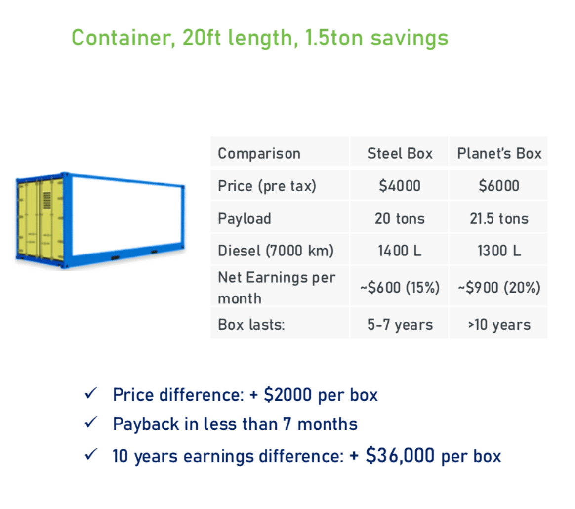 "Steel containers weigh 330kg, ours weigh 130kg—200kg saved. In the same fuel consumption, they can carry 200kg extra payload. If you reduce 200kg, you use 7% less diesel."