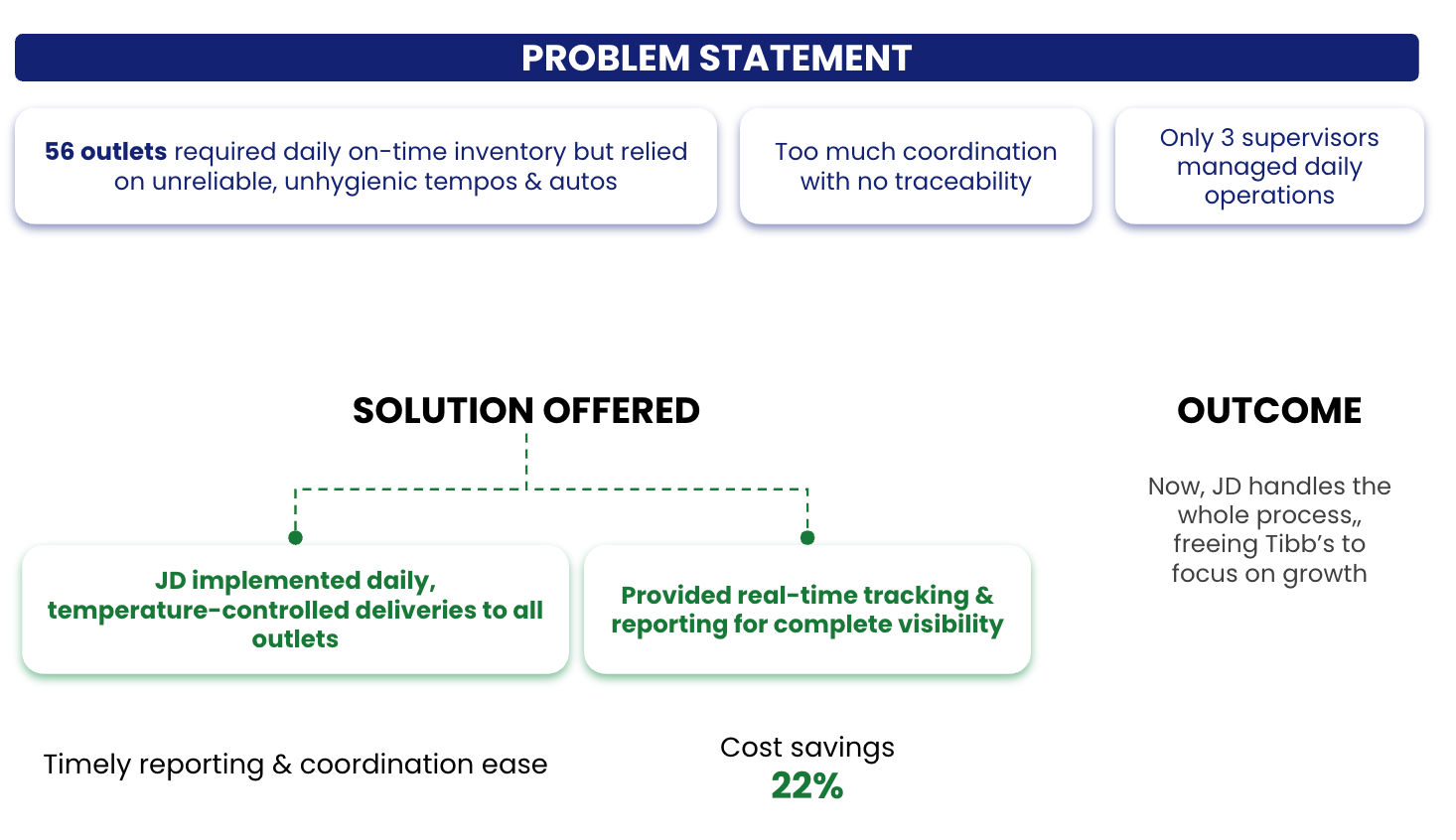 “We have been using JD since April 2022 for the daily logistics for our outlets in Mumbai,” says Tibb.