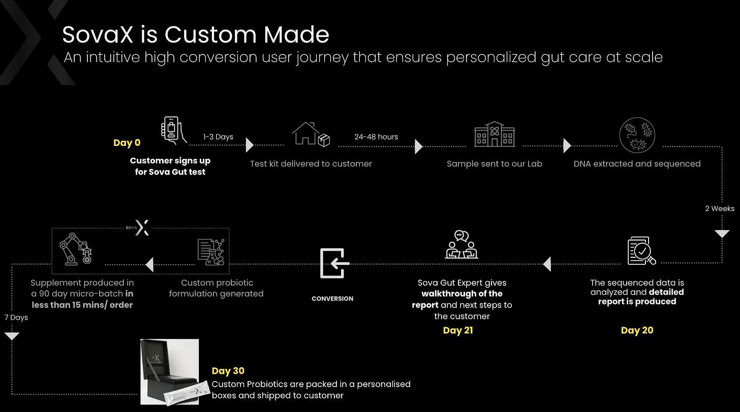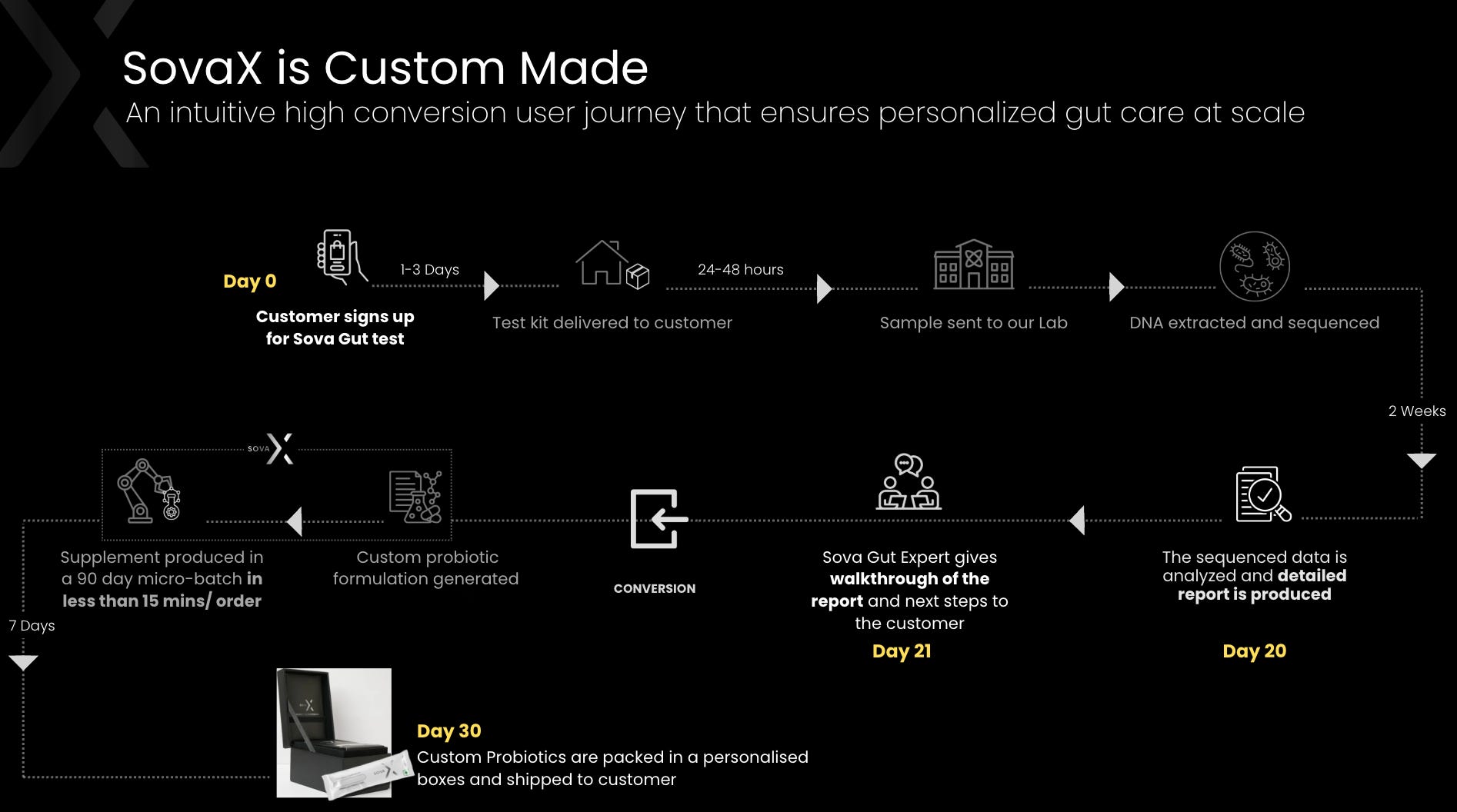The company's breakthrough innovation is SovaX - truly personalized probiotics that are manufactured automatically in individual batches of 90 days' supply in less than 15 minutes per order (manufacturing time).