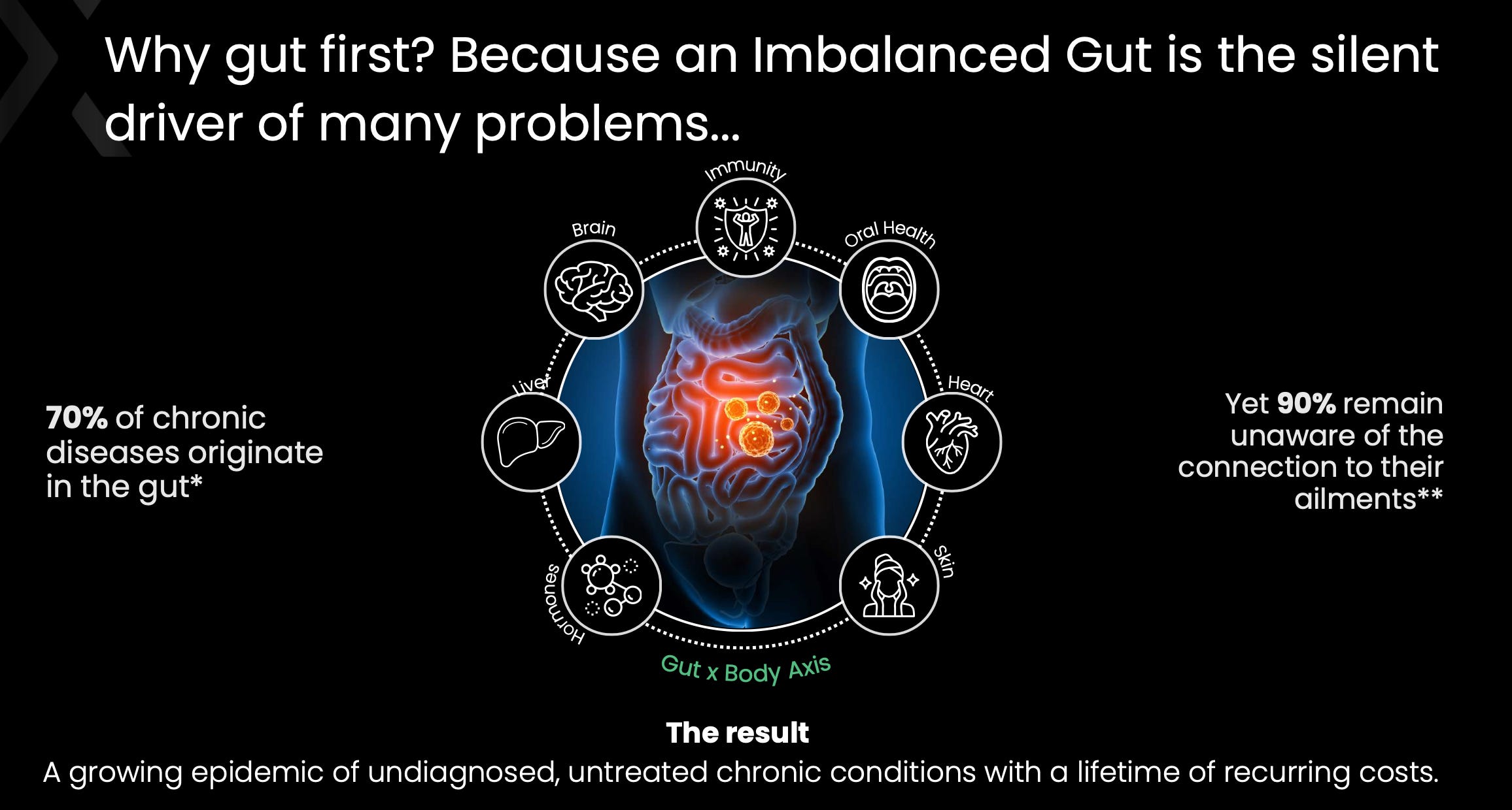 “70% of chronic diseases originate in the gut,” Max notes, citing research from NIH and Science Direct. “This shows lack of awareness in the market.”